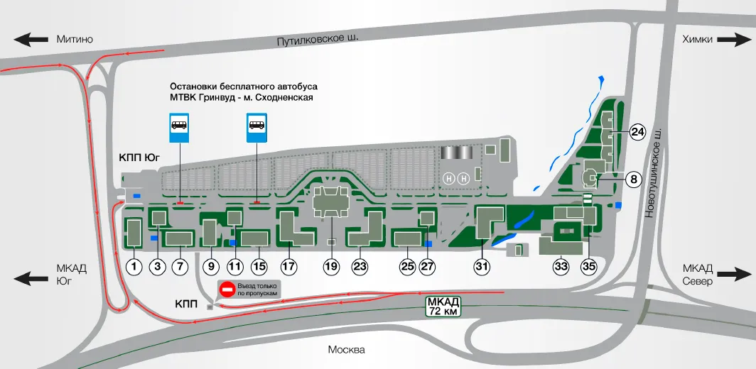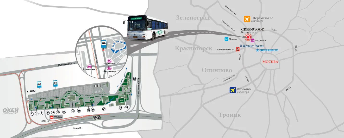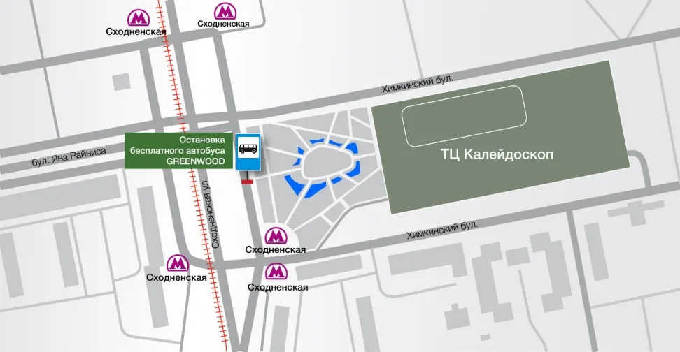 От станции метро «Сходненская» до бизнес-парка «ГРИНВУД» курсирует бесплатный автобус. Выход к остановке автобусов «ГРИНВУД»: последний вагон из центра, из стеклянных дверей два раза повернуть налево, остановка находится напротив торгового центра «Калейдоскоп».