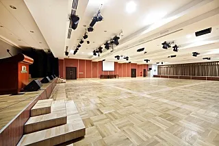 «Хрустальный» зал нашего конгресс-центра сочетает в себе парадный дворцовый интерьер и современную мультимедийную начинку, позволяющую провести как торжественную встречу, так и свадебный банкет. К услугам наших гостей современный потолочный звук, экран и проектор, радиомикрофоны, а также личный холл с диванами, гардеробом и туалетными комнатами. Никто не помешает вам полностью сосредоточиться на проходящем событии.