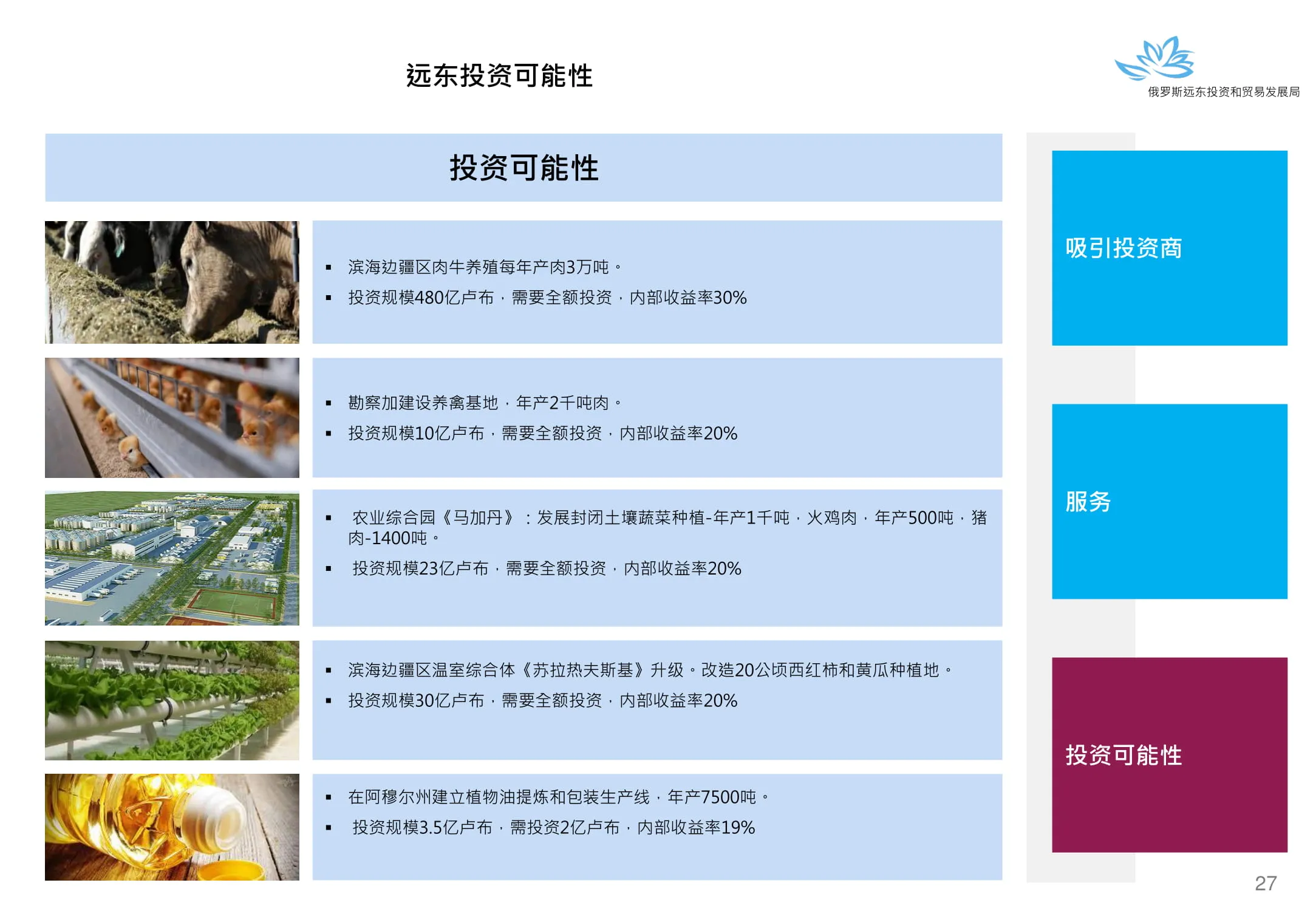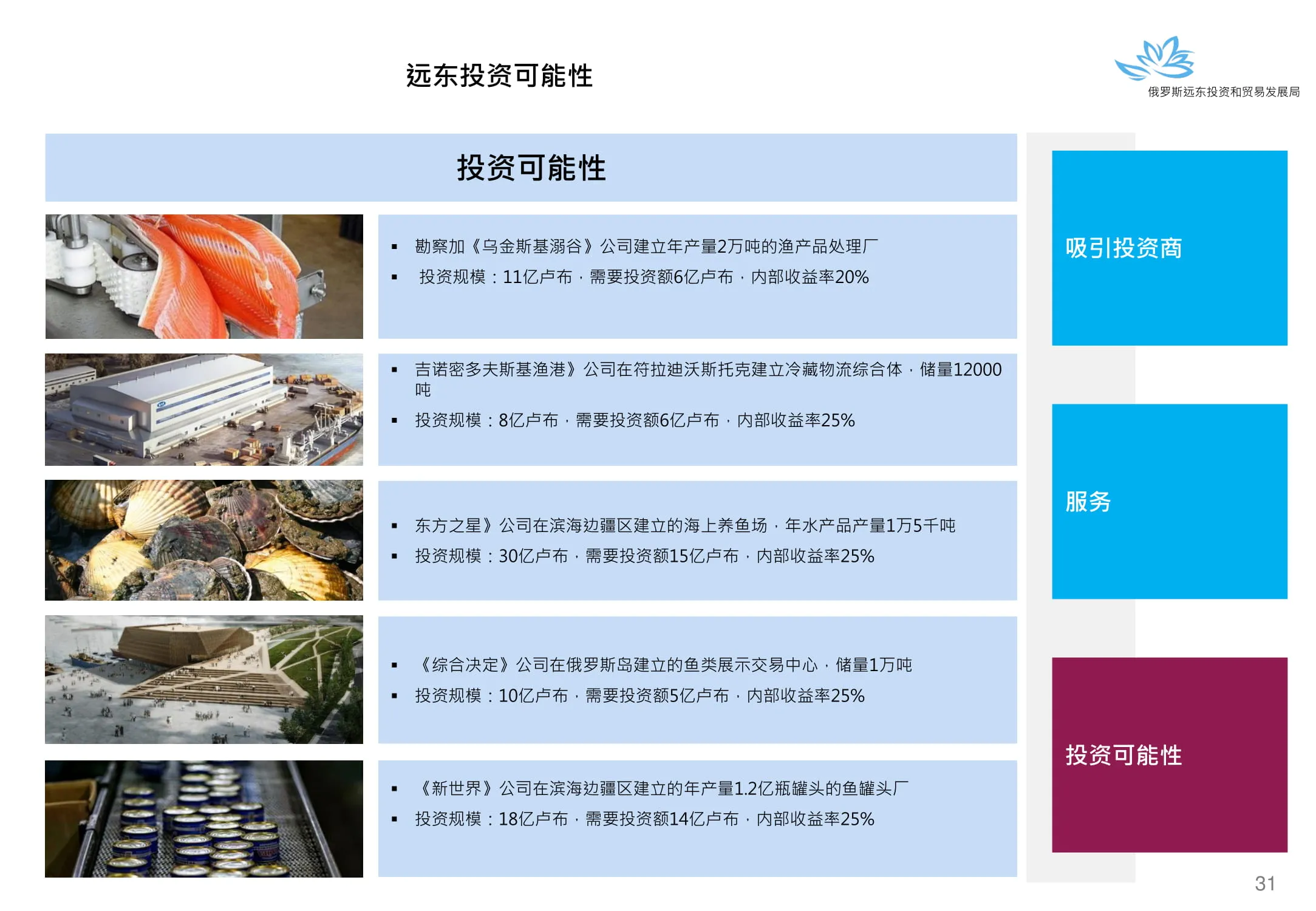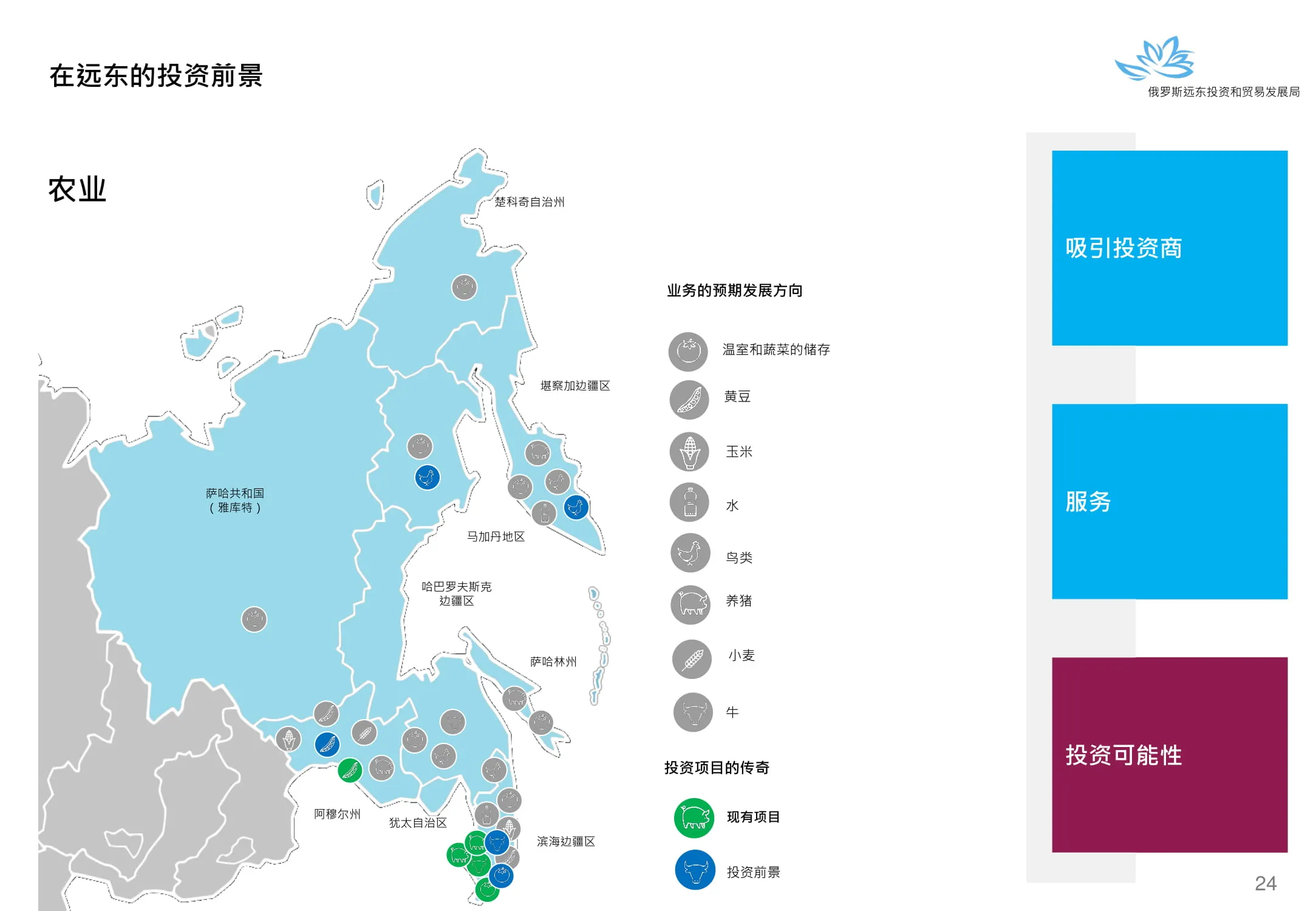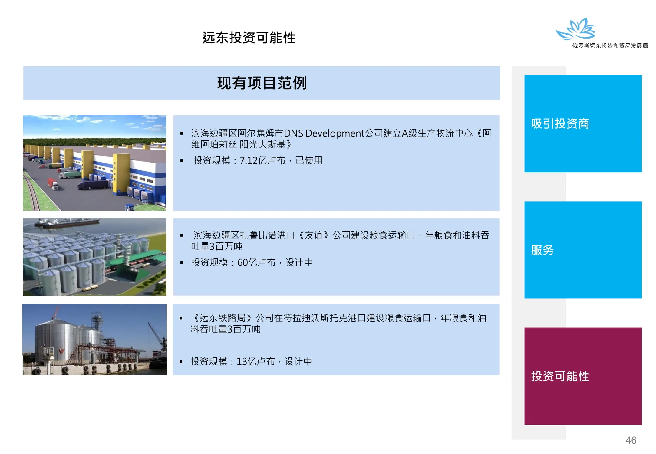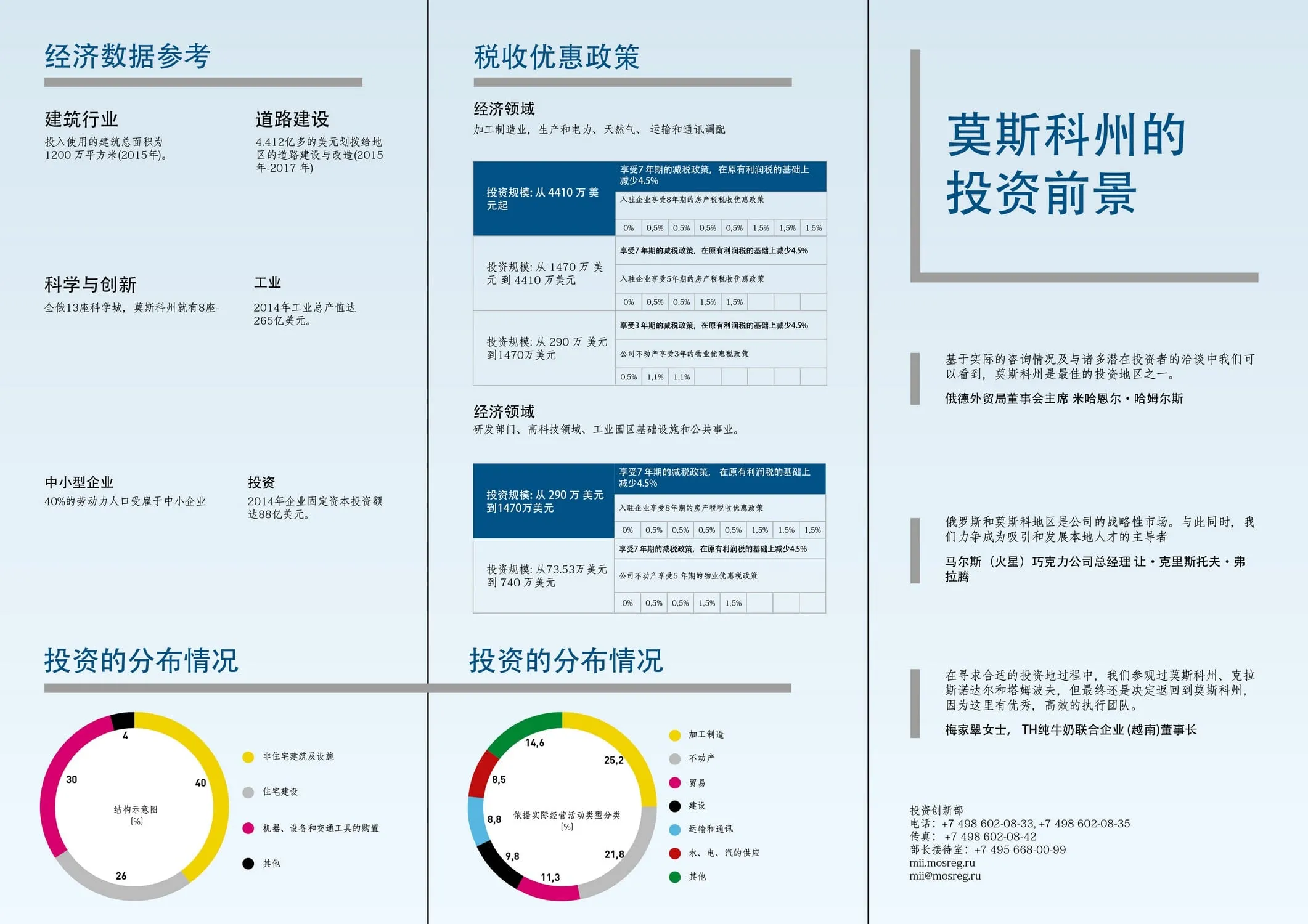 Инвестиции в России Инвестиционный потенциал MO (кит.) Государственное финансирование и инвестиции в сельское хозяйство Подмосковья (кит.) Инвестиционные возможности на Дальнем Востоке (рус.) Инвестиционные возможности на Дальнем Востоке (анг.) Инвестиционные возможности на Дальнем Востоке (кит.)